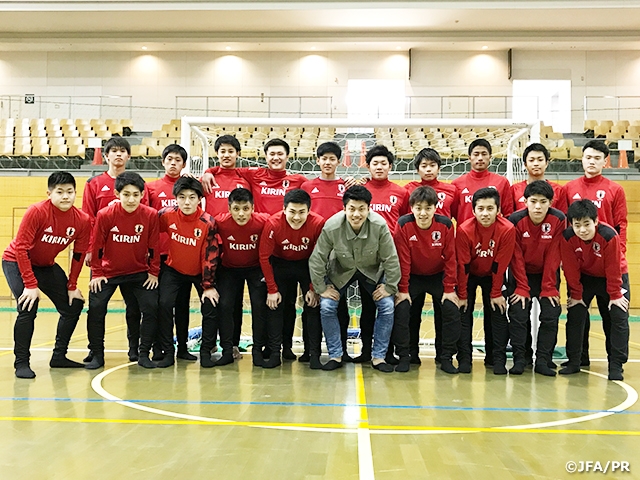 4月9日(月)より茨城県内でトレーニングキャンプを行っているU-19フットサル日本代表は、10日(火)、11日(水)と連日の2部トレーニングで調整。限られた時間の中で鈴木隆二監督が求める戦術をチームに浸透させるため、トレーニング開始前には必ずビデオミーティングを実施し、選手たちへ意図を伝えていきます。トレーニングでは一つ一つのプレーを止めて確認、選手たちに狙いを説明。全体のチーム戦術はもちろん、それぞれのポジションごとに特化した内容を盛り込みながら強度の高いプレーを要求し、選手たちもそれに応えていきます。10日(火)には現在フットサル日本代表でも活躍する清水和也選手(フウガドールすみだ)が訪れ、2017年にタイで行われたAFC U-20フットサル選手権での経験を後輩たちに伝え、チームを激励しました。