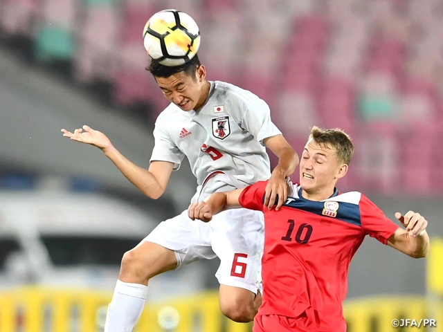直前のミーテングでは森山監督から遠征メンバー22人全員で戦うこと、機動力やラストプレーの質にこだわることを確認して試合に送り出されました。前半は日本は引き気味の相手に対して押し込む形でゲームをスタートさせました。何度かゴール前までボールを運びチャンスを作っていく日本ですが、最後の1歩が届かず得点に至りません。また、ロングボールのこぼれ球を拾われシュートを打たれてしまうシーンもありました。しかし、14分にFW唐山翔自選手が抜け出した所でファウルをもらいPKのチャンスを得ます。そのPKを自身で決めて日本が先制に成功します。また、17分にはMF山根陸選手のスルーパスにまたもFW唐山翔自選手が抜け出すとキーパーもかわし冷静にゴールに流し込みます。幸先よく2点を先制した日本はその後も立て続けに決定機を作り出しますがシュートがゴールマウスを捉えられません。守備ではDF陣を中心にしっかりとブロックして2-0のまま前半を終了します。