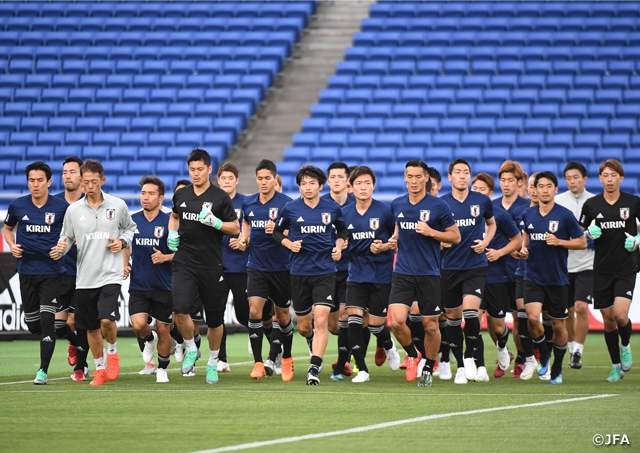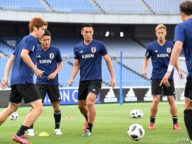 両チームともこの日、試合会場の日産スタジアムで公式練習に臨み、SAMURAI BLUEは26人全員が揃ってランニングで練習をスタートさせました。冒頭の15分以降は非公開にして、戦術の確認やシュート練習などを行いました。
