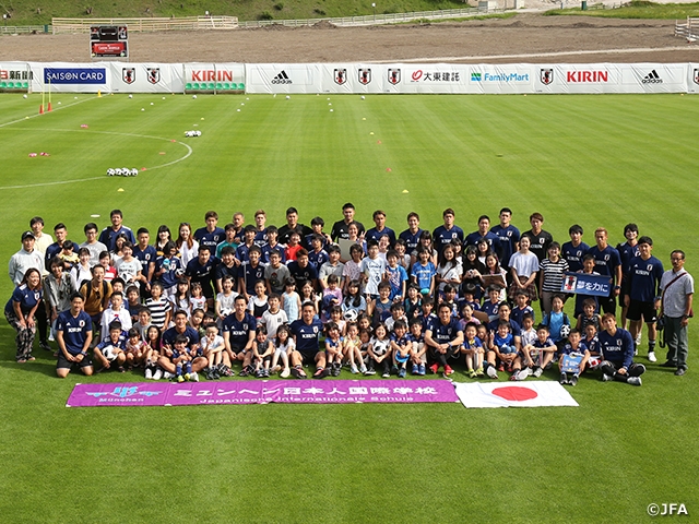 ミュンヘン日本人学校の約190人とウィーン日本人学校の約10人は練習前にはフィールドで選手たちと記念撮影。練習後には選手たちにサインをもらうと、チームバスへ引き上げる選手たちに「さようなら」と元気よく声をかけ、選手たちはこれに手を振り、笑顔で応えていました。