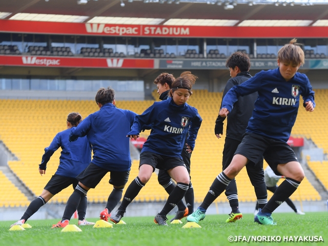 午後には試合会場となるWestpack Stadiumでの公式トレーニングで、芝の状態を確認しながら最終調整を行いました。ウォーミングアップ後、2グループに分かれてのパス回しや、6対6+1フリーマン形式のトレーニングでは、日本らしいテンポを崩すことなく、選手間で言葉を交わしながら修正を加えていました。その後、攻撃陣は攻撃の連係からフィニッシュまでの流れを、守備陣はクロス対応などの確認を行い、約1時間のメニューを終えました。