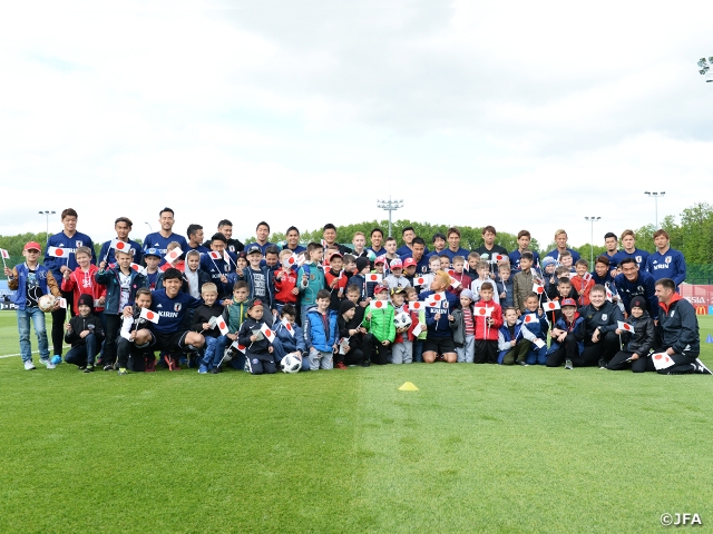 その中には、モスクワから駆け付けた在モスクワ日本人学校の生徒約20人と、地元のFCルビン・カザンアカデミーの年少クラスの選手約40人の姿もあり、この約60人の子供たちは、練習前にピッチで選手たちと記念撮影。小型の日の丸の旗やユニフォームなど、思い思いのも品に選手からサインをもらって、笑顔を見せていました。
