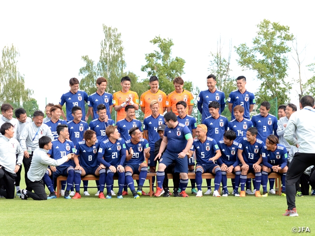 この日の練習前にはチームの集合写真を撮影。スタッフを交えての撮影では、ロジスティックス担当者が選手と同じユニフォーム姿にキャプテンマークを巻いて登場すると、選手が大笑い。さらに、西野監督が自分の膝の上に座らせると、一層大きな笑いがわき起こり、明るい雰囲気に包まれました。