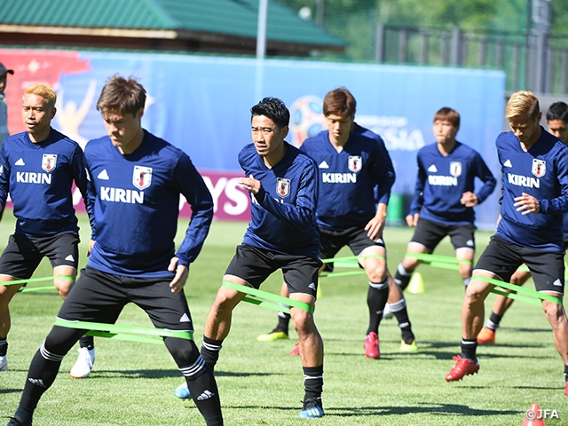 初夏の風物詩でもあるポプラの綿毛がフワフワと飛ぶ中、チームは前日に引き続いてコロンビア戦のキックオフ時間に合わせて練習を開始。報道陣に公開した冒頭15分の練習では、ゴムチューブを使った歩行などで筋力強化を図り、さらに2人一組でパス交換を行いました。