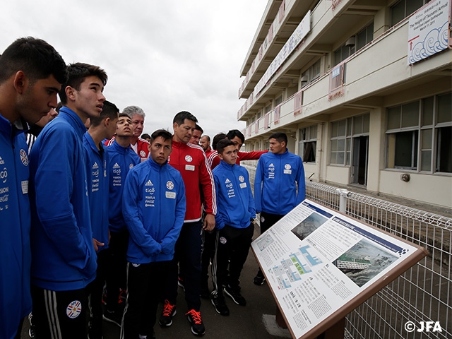 選手たちはまず初めに、仙台市立荒浜小学校を訪れました。荒浜小のある仙台市若林区荒浜は、多くの住民が津波の被害により犠牲となった地区で、津波が4階建ての校舎の2階まで押し寄せました。現在は廃校となっている同校の校舎には、倒れた鉄柵などがそのままに残されているほか、震災直後の写真の展示や映像の上映コーナーが設けられています。内陸国で津波が起きることのないパラグアイや、ほとんど地震を体験したことがないというセネガルの選手たちは、ガイドの説明に耳を傾けるとともに、ひとつひとつ真剣な眼差しで見学しました。