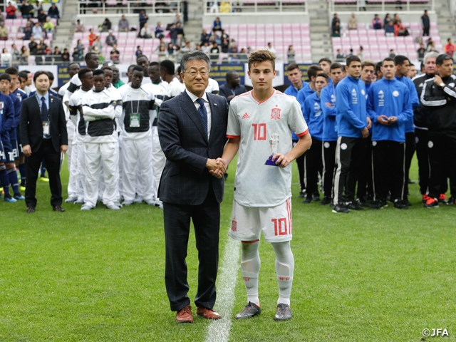 後半に入り、ボールを支配する時間が増えた日本は84分、後方からの浮かせたボールに足を伸ばしたMF成岡輝瑠選手のゴールでなんとか1点を返します。しかし直後の87分、再びスペインにゴールを許し、日本は1-3でスペインに敗れました。この結果、U-16スペイン代表が優勝しました。