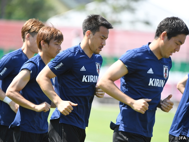 午前中から強烈な日差しが照りつけ、空には入道雲も現れる中、練習場に集合した選手たちは、公開された冒頭15分の部分ではランニングやストレッチを行い、コンディショニング調整に努めました。その後、非公開となった部分で、ポーランド戦へ向けた戦術の確認を行いました。
