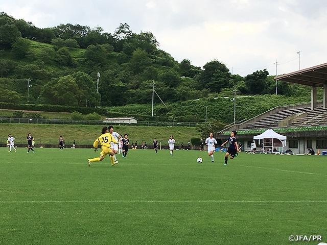 同じ年代のチームとの対戦ということもあり、「勝たなければ」という思いが強い選手がいる中の立ち上がりでした。7分には大澤春花選手が中央から左サイドの水野蕗奈選手へスルーパスし、シュートまでいきましたが得点になりません。一進一退の攻防の中、終了間際の39分、大澤選手のパスを受けた森田美紗希選手が左サイドからシュートし、ゴール。1-0とし1本目を終えます。