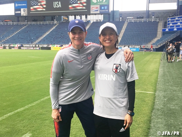 午後の公式練習は冒頭15分のみメディアに公開され、翌日に控えたアメリカ女子代表との大会初戦に向けて体と頭の準備に集中します。なでしこジャパンの後にトレーニングを行うアメリカ女子代表が姿を表し、旧知の仲であるジル・エリス監督を見つけた高倉麻子監督が駆け寄ると、昨年の大会以来の再会を楽しむように笑顔で話し込む一幕も見られました。明日の試合では親友が対戦相手となり、一層熱い試合を見せてくれることでしょう。