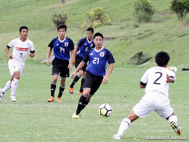 13日(木)には大会前最後となるトレーニングマッチに水戸ホーリーホックU-18と鹿島アントラーズユースを迎え、それぞれ40分ハーフでゲームを実施しました。最初に水戸ホーリーホックU-18と対戦したチームは、相手の積極的で激しいプレーに押され、良いところを出せない時間帯が続いたものの、後半14分にFW青木友佑選手が得点を奪います。その後も相手にチャンスを作られるシーンもありましたが無失点に抑え、1対0で勝利しました。最初の試合から全員の選手を入れ替えて臨んだ2戦目の鹿島アントラーズユースとの試合では、日本チームは立ち上がりからワンタッチでボールを繋ぎ、連動した攻撃で試合のペースを掴みます。前半25分にはFW荒木遼太郎選手がフリーキックを直接決めて先制します。そこからはゴールラッシュを見せ最終的には6対0で勝利し、大会に向けて弾みのつくゲームとなりました。