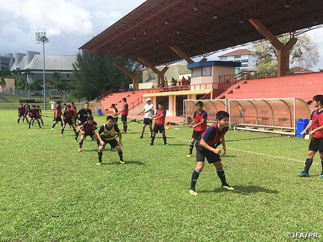 マレーシア3日目となった16日(日)は、午前・午後の2部トレーニングを行いました。20日(木)のU-16タイ代表との大会初戦へ向け、コンディショニング面で最後の追い込みを図ると同時に、攻撃の戦術的なトレーニングも行い、午後のトレーニング終盤には、ピッチ半面で11対11を行いました。ピッチ外では終始リラックスした表情を見せる選手たちも、ピッチ上では集中した面持ちでこの日のトレーニングを終えました。