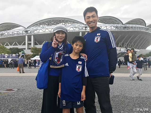 家族3人で観戦に来ました。テレビではよく日本代表の試合を見ていますが、スタジアムに家族みんなで来たのは今日が初めてです。私自身もスタジアムで日本代表の試合を観戦するのは約20年ぶりになります。また新潟で代表戦を実施してほしいです。息子は所属チームの仲間と公開練習を見学して、大好きな大迫選手と写真を撮ることができて喜んでいました。今日は大迫選手のゴールを期待しています。広島出身なので、森保監督にはぜひ頑張ってほしいです。