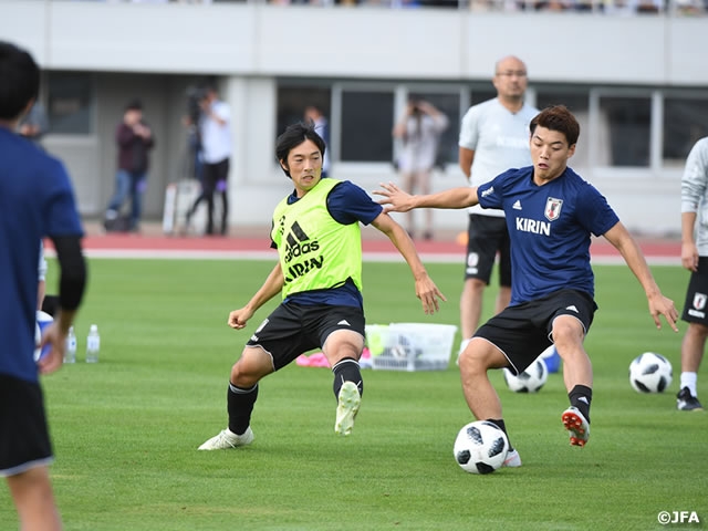 夏を思わせる日差しの下で始まった練習では、前日の試合に先発したMF原口元気選手(ハノーファー96)やMF南野拓実選手(ザルツブルク)らと後半途中出場したFW川又堅碁選手(ジュビロ磐田)とFW北川航也選手(清水エスパルス)は、ランニングやストレッチなど軽めの内容で早目に切り上げましたが、それ以外の選手は約1時間半、汗を流しました。