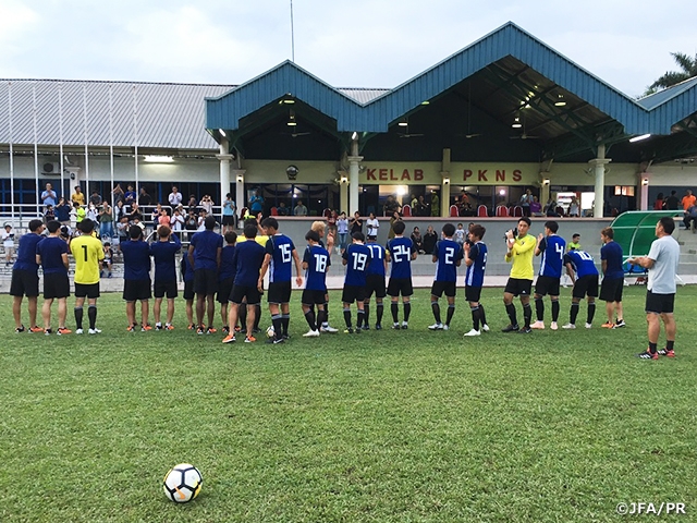 後半、メンバーが全員変わりましたが、日本はより攻撃面で連動性を活性化させ、次々と決定機を作ります。守備面も非常に切り替えが早く、相手が狙うカウンター攻撃をしっかり予測して自陣に入れさせません。両サイドから、DF菅原由勢選手とDF東俊希選手が攻撃参加を繰り返し、チャンスを演出。61分には、菅原選手が中央にパス交換から入り込みスルーパス、パスを受けたFW斉藤光毅選手が相手GKのタイミングを外してシュートを狙いますが、シュートを惜しくもポストに弾かれます。64分には、スムーズなパス交換が展開され、斉藤光毅選手が左サイドに叩き、東選手が見事なクロスを上げると、FW久保建英選手が上手くヘディングで合わせ3点目を奪います。69分には、斉藤光毅自ら得たPKを冷静に決めて4点目。その後も日本は攻撃の手を緩めません。MF伊藤洋輝選手とMF藤本寛也選手が前線やサイドに鋭いパスを何度も通すと、チーム全体で多くの攻撃パターンを展開していきます。その後は惜しいチャンスを演出するも、追加点は奪えず、4-0で試合は終了しました。AFC U-19選手権インドネシア2018大事な初戦に向けて、コンディション調整、暑熱環境対策含め充実したマレーシア遠征となりました。チームはいよいよ16日(火)、試合会場となるインドネシア・ボゴールに入り、19日(金)のU-19朝鮮民主主義人民共和国代表戦に向けて最後の調整を重ねます。