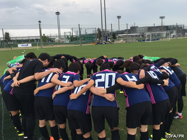 午後はスピードや体格で勝る男子高校生を相手に、メンバーを入れ替えながら30分×3本の練習試合を戦いました。ピッチに出る前のミーティングでは、池田監督から「攻守で距離感を大切にしよう」と共有がなされ、攻撃の際のサポートや守備の際のカバーの位置など味方との距離感を意識して試合に臨みました。相手に押し込まれている時間が長くても、より良い準備とより早い判断で対応していこう、と前向きな声がピッチ内、さらにはベンチからも発せられ、選手たちは最後まで集中力を切らすことなく戦い続けました。夜のミーティング後には、チーム全員でキリンチャレンジカップ2018 対ウルグアイ戦に出場したSAMURAI BLUE(日本代表)を応援し、同時にサッカー知識の習得、共有を行う時間となりました。