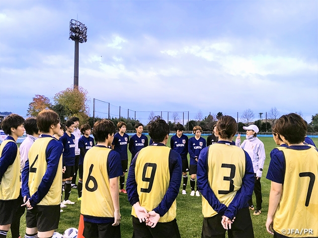 午前はフィジカル測定を行った後に、パス&コントロール、ポゼッションのトレーニングを行いました。昨日はリカバリートレーニングを行った選手たちも合流し、全員で明るい雰囲気の中トレーニングに取り組みました。午後のトレーニングに出る前には全体ミーティングを行い、なでしこジャパンの取り組みやコンセプトを共有しました。海外の試合映像となでしこジャパンの実際の試合映像を織り交ぜ、選手たちは具体的なプレーのイメージをもって午後のトレーニングに臨みました。