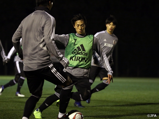 合宿2日目のこの日、夕方から始まった練習には柴崎選手と槙野選手が加わって、トレーニングパートナー6選手を含めて19人で実施。細かいステップワークとダッシュを組み合わせた動き、2グループに分かれてのボール回しや、リフティングからパス出しなど、選手たちはコンディショニングを中心としたメニューに取り組みました。