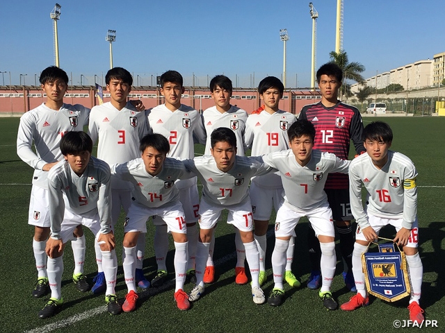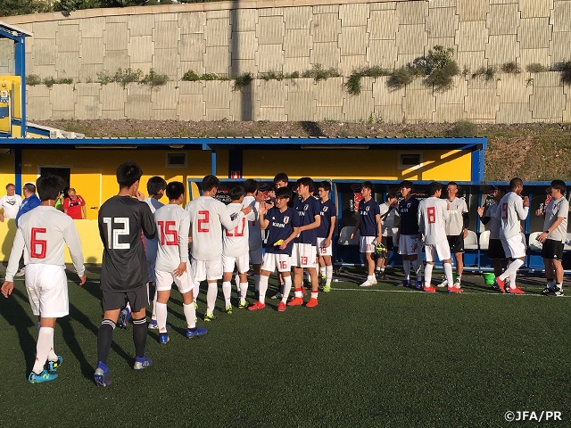 初戦からメンバーを大幅に変更した日本は、この試合も立ち上がりから積極的に仕掛けます。試合開始3分、前線から激しいプレスを掛けると、相手が慌てた隙を逃さず、前線で相手のパスを奪い、FW藤尾翔太選手がゴール前で相手DFと2対1のチャンスを作ると、スルーパスを送ったMF松橋優安選手がシュートを放ちますが、相手GKに防がれます。それでも立て続けに攻め込むと、CKから一度はクリアされたボールを、この試合ゲームキャプテンを務めたMF岩本翔選手がクロスを上げ、相手のオウンゴールを誘い幸先よく先制点を奪います。その後も、藤尾選手、FW染野唯月選手が決定機を迎えますが決められずにいると、早くもメンバーを変更し始めた相手が徐々に力を発揮します。初戦同様、激しくボールを奪うと、素早く前線に繋げ、豪快なドリブルから前へ前へと攻め込んで来ます。25分、日本はFKを与えると、シュートがポストに当たる危ないピンチを迎えますが、我慢の時間を耐えると、完全に日本がリズムを掴み返します。28分には、この試合何度も左サイドを突破したMF松村優太選手がPKを獲得、自ら決めて追加点を奪います。さらに、35分にはDF山﨑大地選手がクイックでボールをゴール前に送ると、上手く飛び出した松橋選手が相手DFを1人交わしてラストパスを送り、藤尾選手が流し込んで3点目を奪います。前半はそのまま3-0で終了します。