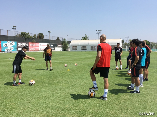 サンチャゴ日本人学校とのサッカー交流会は、在チリ日本国大使館のご協力のもと実現に至りました。40名の小・中学生生徒が参加し、U-17日本代表の森山佳郎監督をはじめとするコーチ陣や選手と、交流の場を楽しんでいました。