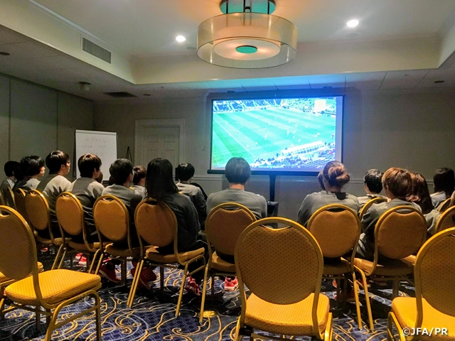 前日は初戦のアメリカ女子代表戦を振り返るミーティングを行い、試合結果からチームの課題を分析しましたが、この日は対戦相手の分析ということで、ブラジル女子代表の試合映像を使ってチーム戦術やキープレイヤーの特徴が説明されました。分析を担当する平川雅之テクニカルスタッフはミーティングの冒頭で、ただ映像を見て説明を聞くだけでなく、サッカーにおける4つの局面(①攻撃 ②攻撃から守備 ③守備 ④守備から攻撃)に自分たちを当てはめて、翌日に対戦するブラジル女子代表を具体的にイメージすることを強調して説明に入りました。