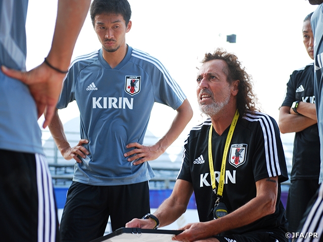 AFCビーチサッカー選手権は夕方から夜のキックオフが多いため、タイ代表とのトレーニングマッチは本番を想定し、同じ時間帯の20時よりスタートしました。試合は相手に先制を許し、難しい展開になりますが、結果は3-3の同点で終了。実戦の中で今までやってきたことを確認し合い、成果と課題の両方が出た収穫のある内容でした。