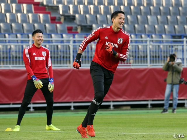 前日、コロンビア戦を戦った横浜から移動してきたチームは、寒さの残る神戸で夕方から試合会場のノエビアスタジアム神戸で練習を開始。公開された冒頭15分の練習では、ランニングやストレッチ、ボール回しなどを行い、GK3選手もボール回しやペナルティエリア内からのボールをキャッチングして体をほぐしました。