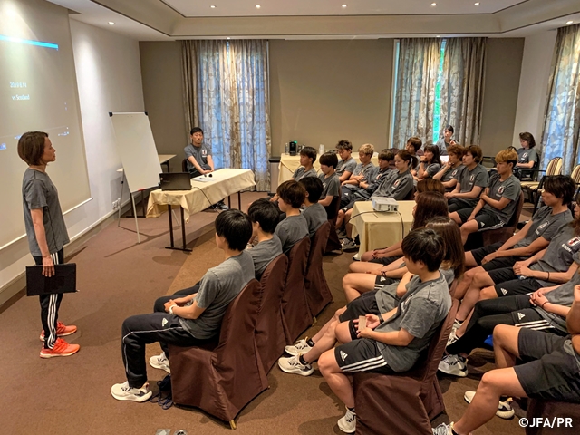 夕食前には、スコットランド戦を分析した映像で振り返りました。攻撃、守備の両面で狙いどおりに実践できた場面と、課題として残ったシーンをチームで共有。高倉麻子監督は、「全員気持ちのこもったプレーだった」と振り返ると、「フォワードは点をとってくれた。中盤はハードワークしてくれた。守備陣は守備だけでなく攻撃のスタートにもなっていた」とそれぞれのポジションで仕事を成し遂げたことを評価しました。