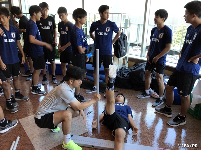 台風の影響もありましたが、無事に全23選手が千葉県内の宿舎に集合し、初日はコンディショニングチェックとミーティングをメインに実施しました。AFC U-16選手権2020予選の指揮を執る森山佳郎監督がU-17日本代表のエクアドル遠征に帯同中のため、国内合宿は濱崎芳己監督代行が担当します。