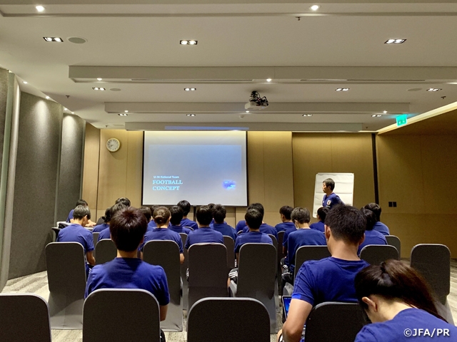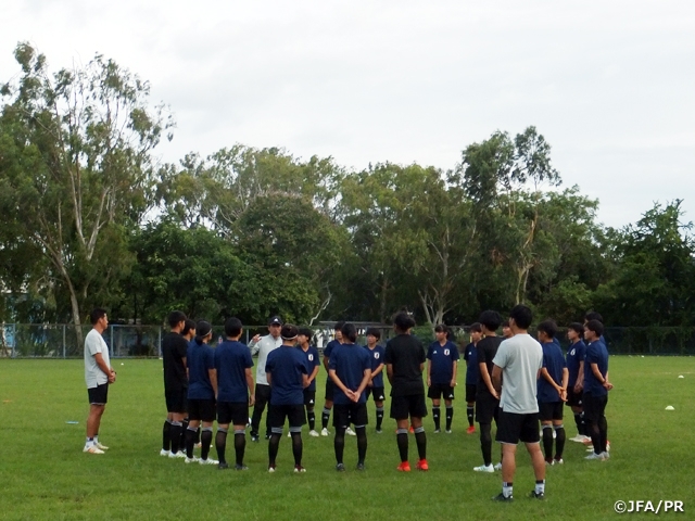 夜中の移動ということでまとまった睡眠が少ない中、無事にタイに到着し、初日を迎えました。大会本番の現地に入ったということで、選手もいよいよ始まるんだと感じている様子が見受けられました。サッカーのコンセプトやテーマを深めることよりも、長い移動と睡眠不足ということで体のコンディションを戻すメニューを行いました。そのようなトレーニングの中でも選手の取り組む姿勢やチーム全体の雰囲気はとても良かったと感じています。これから長丁場で厳しい戦いが求められる今大会が始まりますが、ここで結果を残すためのとても良いスタートが切れたと思いました。