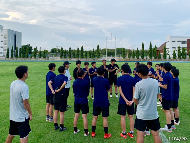 この代表チームに入って、雰囲気に慣れ、自分のできることを全部出せるようになってきたことが私の成長した点だと思っています。特に止める蹴るの質を意識してやってきた部分での成果が出てきたと感じています。チームは一人一人コミュニケーションをとって協力してやってきたので、チームワークが高まってきています。チームメイトとのコンビネーションや一瞬のタイミングを事前合宿で確認し、タイに来てからは環境に慣れつつもベストを出せるよう準備をしてきました。そして今日はオーストラリア戦前の最後の練習でしたが、みんなが声掛けをして初戦に向けてモチベーションが上がる雰囲気でトレーニングすることができました。その初戦で、個人的には代表で成長した部分を出しながら、チームとしては良いサッカー、このチームらしいサッカーをして勝って勢いに乗れることが大事だと思うので、みんな一人一人全員が全力を出して勝てるように頑張りたいです。