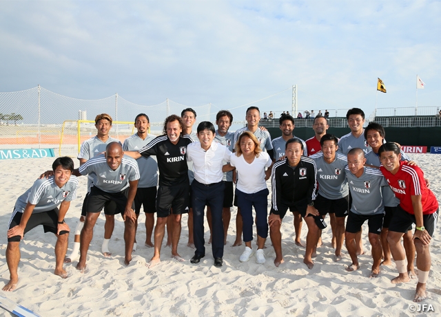 スケジュールの都合で日本の試合を観戦することはかないませんでしたが、前日練習で「初めてビーチサッカーを生で見ることができた」という森保監督は、「ビーチサッカーは、バランス感覚やテクニックの高さも必要で、体力的にもハードな中でプレーするのでメンタルもたくましい。とても迫力があって、引きつけられた」とコメント。また、ビーチサッカー日本代表には、「2日間の国際親善試合、そして11月のワールドカップで思い切ってプレーほしい。日本代表として、サッカーファミリーとして、ともに世界で戦っていきましょう」と激励の言葉を送りました。