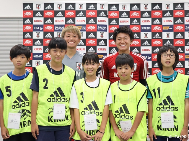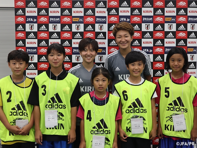 子どもたちからは、「小学校の時はどんな練習をしていましたか?」「どうやったらシュートが強く打てますか?」といった選手ならではの質問が飛び、なでしこジャパンの選手たちは丁寧に、時にはデモンストレーションも交えながら答えていました。