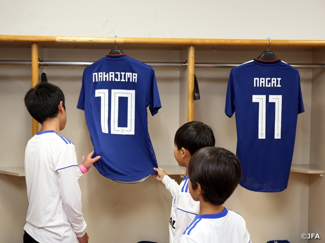 各プログラムには、子どもたちが普段経験できない内容が盛り込まれています。例えば、試合前の日本代表のロッカールームやチームベンチを見学することができます。ロッカールームでは、選手のユニフォームが試合前に準備されていて、着用するユニフォームに触れられる特別な機会が設けられています。