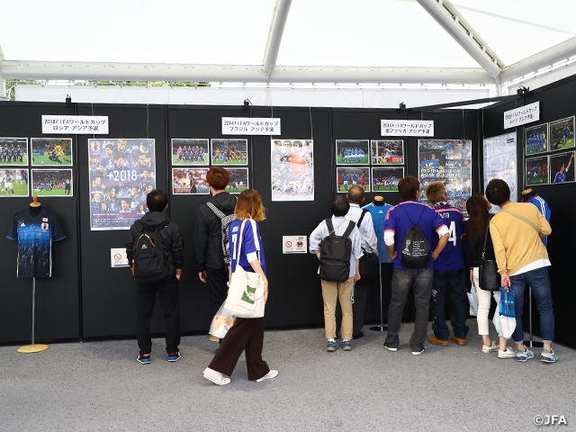 ブースでは、アジア最終予選(Road to Russia)、2014FIFAワールドカップブラジル アジア最終予選、2010FIFAワールドカップ南アフリカ アジア最終予選、2006FIFAワールドカップドイツ アジア地区最終予選など過去のワールドカップ予選のポスターや、選手、監督のサイン入りユニフォーム、ミーティング資料などを展示。来場者は当時を懐かしむ様子で話をしたり、展示品をカメラに収めるなど、試合前から盛り上がりを見せていました。