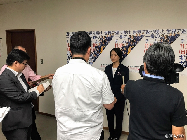 なでしこジャパンの活動が北九州市で行われることについて、北橋市長から「大変喜ばしいこと、心から感謝し、歓迎します」と、ラグビーウェールズ代表のワールドカップ事前キャンプをホストした北九州市のスポーツ熱を感じる言葉をいただきました。ラグビーワールドカップで初の決勝トーナメント進出という躍進を遂げたラグビー日本代表の戦いに感銘を受けた高倉監督は「彼らと同じように、見ている人たちに勇気を届けられるような戦いをしたい」と意気込みました。