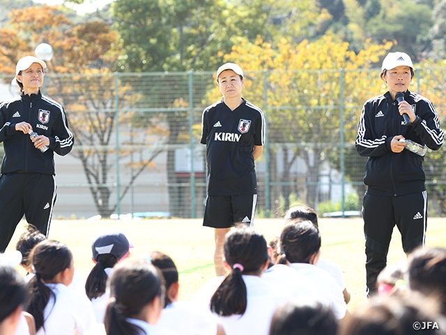秋らしい晴天の中、なでしこジャパンの高倉麻子監督、元なでしこジャパンの小林弥生さん、宮間あやさんを特別ゲストコーチに迎え、小学校1~6年生の女の子、小学校1~4年生の男の子計93名が参加しました。高倉監督から「みんな楽しんでサッカーをやってください」との挨拶があり、パス&コントロールやミニゲームを楽しみました。