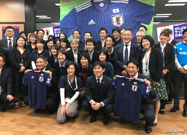 続いて訪問したのは広島市内にあるオフィシャルパートナーであるキリングループのキリンビール中四国統括本部。多くの社員の皆さんの温かい拍手に迎えられました。森保監督は「いつもキリンさんにお邪魔すると熱烈に歓迎していただいて感激しています。日頃から応援していただいている皆様にさらにこうやって直接激励いただくと自分ももっと頑張れる気がします」と感謝の意を伝え、和やかな雰囲気の中、社員の皆さんと交流を深めました。