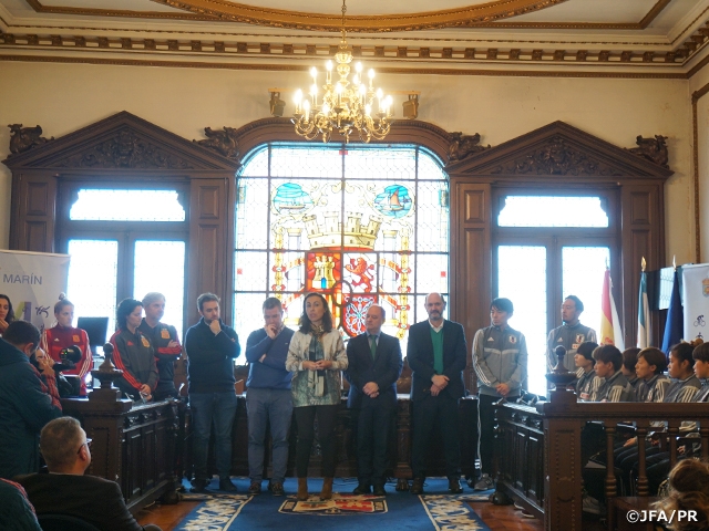 また、午後には試合会場となるマリン市のMaria Ramallo市長をスペインフットサル女子代表チームと共に表敬訪問しました。市長は「マリン市で試合を開催してくれることを非常に喜ばしく思っております。ガリシア州にあるクラブの内4つのクラブが1部リーグに所属しており、また、今回のスペイン代表チームにはガリシア州の出身の選手が6人選ばれています。マリン市はこれまで長きに渡り女性スポーツの活性化に取り組んできました。最初は高い壁が立ちはだかっていましたが、根気強く課題解決に取組んできた結果、現在は以前に比べ女性スポーツ参加が非常に活発になりました。現在は女子フットサルの発展に注力しています。そういった意味でも今回、マリン市でフットサル女子代表チームの試合が開催されることは非常に大きな意味を持っています。明日はどちらかのチームを応援するのではなく、中立の立場で両チームを応援します。両チームの健闘を祈っています」と期待を寄せました。また、マリン市のスポーツカウンシラーであるDaniel Benavides氏は、「ガリシア州では男女問わず多くの子どもたちがフットサルを楽しんでいます。そのような子どもたちのロールモデルとなるようなフットサルのプレーに期待しています」とコメントしました。