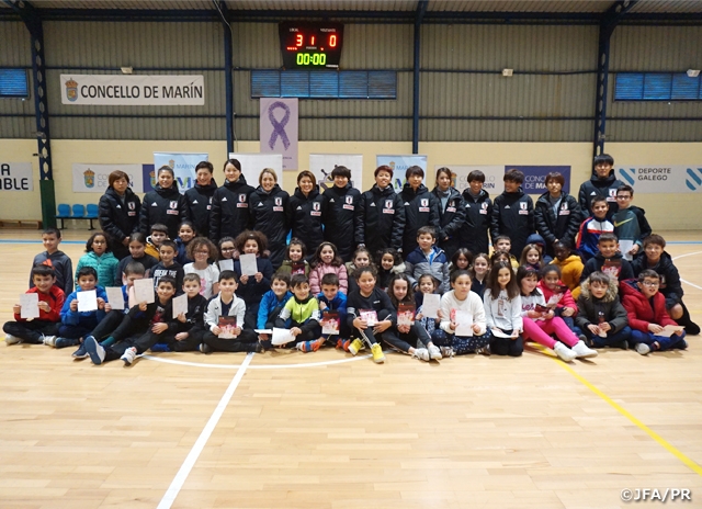 12月6日よりスペイン・ガリシア州でトレーニングキャンプを行っているフットサル日本女子代表チームは12月9日(月)のトレーニング終了後、トレーニング会場の1つを提供してくれた小学校の子どもたちと交流を深めました。日本のアニメが大好き、と話す生徒は流暢な日本語で選手に「おはよう」、「ありがとう」等と積極的に選手に話しかけ、選手もハイタッチをしながら子どもたちとコミュニケーションを図りました。