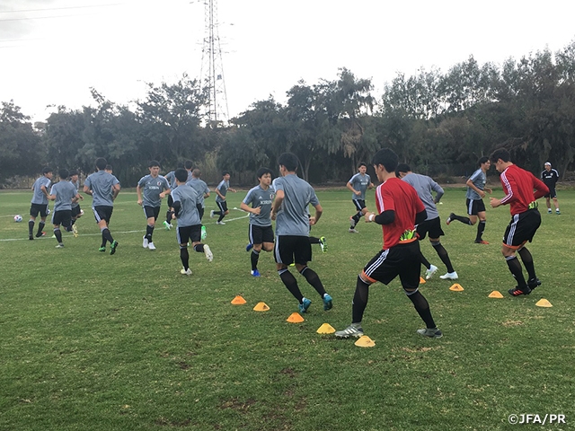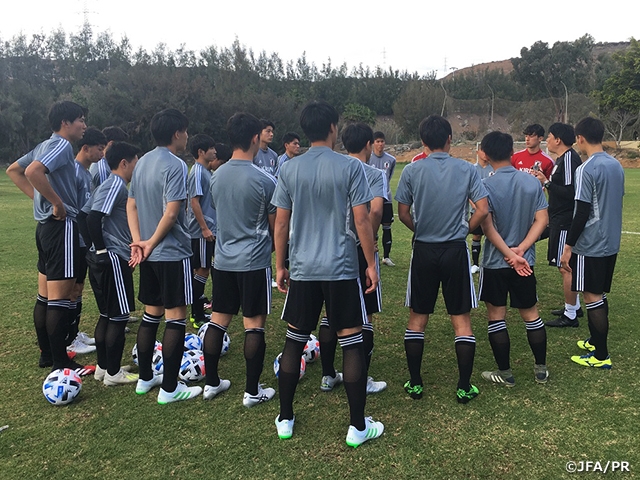午後はピッチに移動し、実践的なトレーニングを実施。しっかりとストレッチで体をほぐすと、早速ボールを使いながらパス&コントールで体を温め、最後はピッチを半分使用した10対10のゲームを実施。初選出された選手たちも最初は戸惑う部分もありましたが、徐々に個人の長所を発揮していきました。明日もトレーニングを重ね、U-18 International Tournament "Copa del Atlantico"初戦でU-18メキシコ代表に望みます。