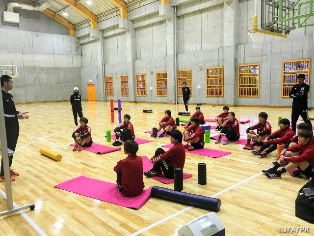その後行われたトレーニングは場所をアリーナに移して行われ、広瀬統一フィジカルコーチの指導のもと、ボールを一切使わないフィジカルトレーニングとなりました。球際の強さに代表される「プレーの強度」を高めることを目的に、チューブやウェイトなどのアイテムを使って体に負荷をかけます。サッカーのパフォーマンスを向上させるために、重心をコントロールする、あるいは力をスムーズに伝えるといった、自分の身体を使いこなせるようになることが目的です。無意識に楽をしようとついつい崩れがちになるフォームをチェックしながら、ひとつひとつのメニューを丁寧にこなしました。この一度のトレーニングで何かが劇的に変わるわけではなく、同じく広瀬フィジカルコーチから先日説明を受けた水分補給や十分な栄養の摂取と同様に、オリンピックまでの間に日々取り組むべきものとして選手たちは意識を高めていました。