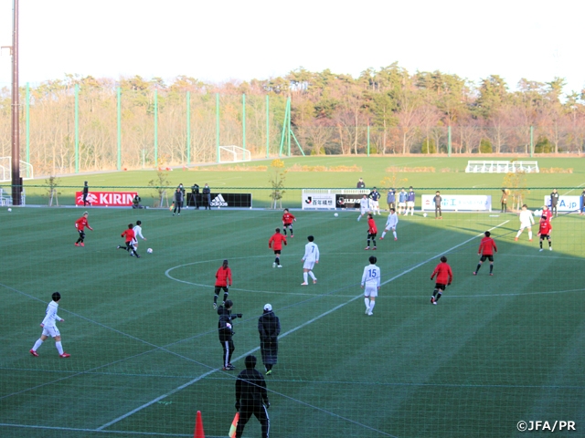 午後は筑波大学の男子サッカー部に協力を依頼し、いわきFC U-18に続いて男子との強度の高いトレーニングが実現しました。当初の見込みより選手の仕上がりが良かったため、ポゼッションやクロス等の合同トレーニングに11対11のゲームを長めに加えることになりました。選手が一様に「速い」と話した男子大学生のプレッシャーを受けながらも、無駄にボールを蹴ることなく丁寧にボールを動かします。相手の圧力の前にミスも生まれますが、それも東京オリンピックに向けた学びに変えて次のアメリカ遠征に臨みます。3月にアメリカで行われるSheBelieves Cupは、アメリカ、イングランド、スペインといった強豪国を相手に、女子ワールドカップ後に完成度を高めてきたなでしこジャパンのサッカーがどこまで通用するのか計る絶好の機会となります。