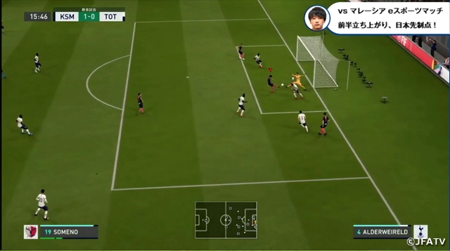 日本は初戦でマレーシアと対戦。第1試合はサッカーe日本代表のWeb Nasri選手が所属チームである鹿島アントラーズを、対戦相手のサッカーeマレーシア代表のハキム選手はイングランド・プレミアリーグのトッテナム・ホットスパーを選択し、ゲーム内時間90分(実時間で6分ハーフ/1試合約12分)の戦いがスタートします。