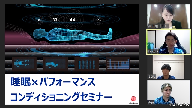第一部では、プロバイダーとして日本代表をサポートしてくださっている西川株式会社様による「睡眠とパフォーマンスのコンディショニングセミナー」を、第二部では今後のサッカーe日本代表活動に関する共有とディスカッションを実施しました。サッカーe日本代表選手として、Web Nasri選手(PlayStation®4部門)、fantom選手(Xbox One部門)およびリザーブメンバーのAgu選手が参加しました。