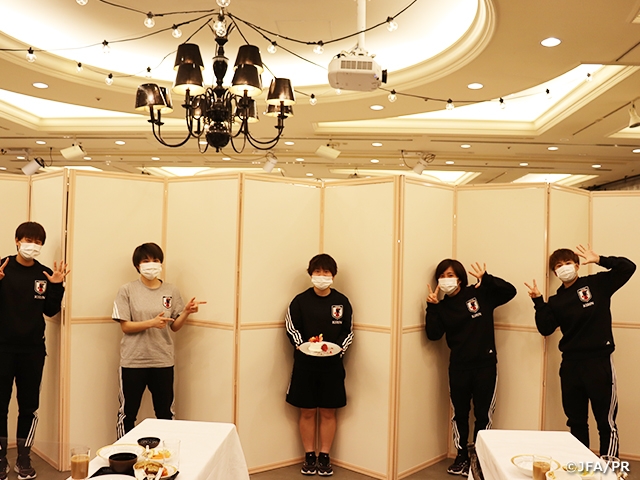 パナマ戦に向けて午前にトレーニングとリカバリーを行ったあとの昼食時には、この日誕生日を迎えた籾木結花選手のお祝いをしました。食事会場が海外組と国内組で分かれているため、一緒に祝うことはできませんが、ホテルからの提案で国内組の会場に映像を映し出すことに。「見た目も中身も25歳相応になれるようにがんばります!」とカメラに向かって抱負を話し、その場で見ている海外組、そしてスクリーンで見ている隣の会場の国内組の笑いを誘っていました。その後、お世話になった仙台のホテルを撤収し、次なる拠点となる千葉県にバスで移動しました。コロナ禍で定められた厳格なバブルの運用に、快く丁寧に応じてくださったホテルの皆さんが見送ってくださり、あらためて多くの方の支えのもとに活動ができていることを実感する場面となりました。