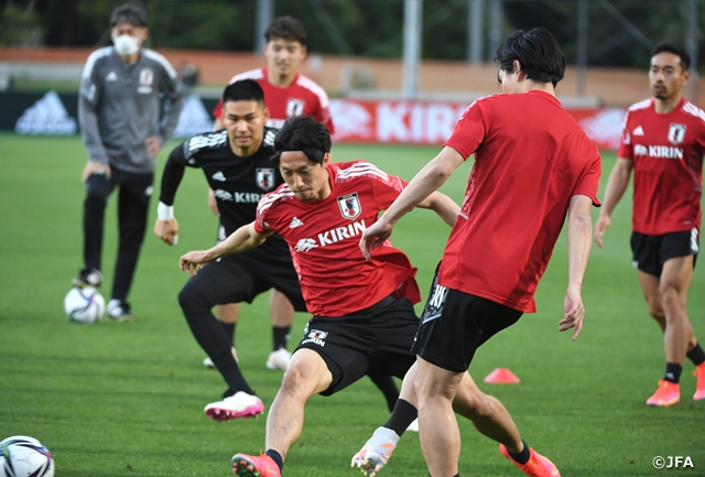 練習が終わる頃には試合を終えたJリーグ所属選手たちがチームに合流。31日からは新しいチーム編成となり、6月の試合に臨みます。