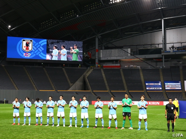 この試合でSAMURAI BLUEはJFA創設100周年記念の特別ユニフォームでプレー。先発メンバーは5月28日のFIFAワールドカップカタール2022アジア2次予選突破を決めたミャンマー戦の先発を中心に、2列目左にMF原口元気選手(1.FCウニオン・ベルリン)を起用。OA(オーバーエイジ)でU-24日本代表へ合流したDF吉田麻也選手(サンプドリア)、DF酒井宏樹選手(オリンピック・マルセイユ)、MF遠藤航選手(VfBシュツットガルト)に代わって、橋本選手がMF守田英正選手(CDサンタ・クララ)とボランチを形成。右サイドバックにDF室屋成選手(ハノーファー96)、DF谷口彰悟選手(川崎フロンターレ)がDF植田直通選手(ニーム・オリンピック)とセンターバックを務めました。