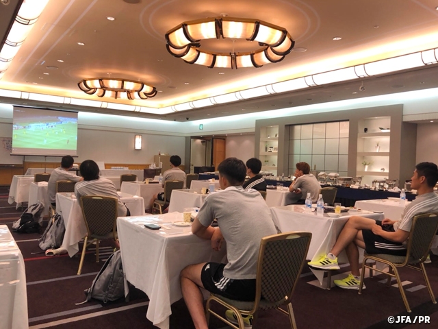 夕食時にはU-24ガーナ代表と戦うU-24日本代表を応援。オーバーエイジとして参加している吉田麻也選手、酒井宏樹選手、遠藤航選手の出場もあって、選手たちは食い入るように試合を観戦しました。6-0で終了のホイッスルが鳴ると、弟分の活躍を称え、それぞれの部屋に戻りました。