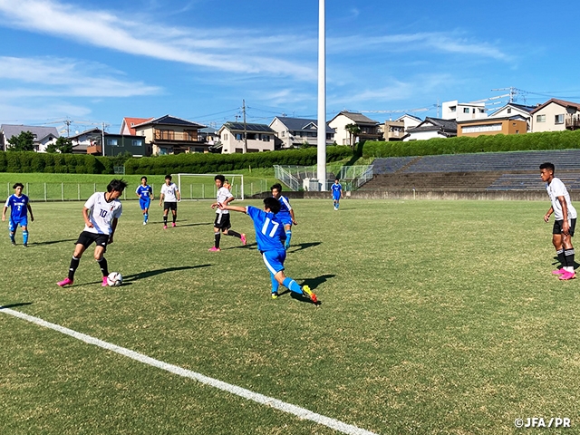 21日(水)にはU-16静岡県選抜とトレーニングマッチ(35分×3本)を実施。U-16静岡県選抜は三重国体に向けて強化を続けていて、東海地域の予選を控えていることもあり、U-15日本代表にとって、素晴らしい対戦相手です。1本目は、お互い攻守に激しい展開が続き、日本は中盤での連動したパス交換からゴールに向かうも、シュートまでが遠く、相手も鋭いサイド展開から一気にチャンスを迎えるも、決定機を互いに決めきれずスコアレスドローで終了。2本目は、相手が攻勢にでると、粘り強く守っていた日本でしたが、52分に右サイドからクロスをフリーで入れられると、ヘディングで上手く合わせられて、先制点を許します。さらに61分、再び右サイドからのスローインからカットインされ、クロスからのシュートを一度は防ぐも、豪快にこぼれ球を押しこまれ2失点目を許します。そのまま2本目は0-2で終了。3本目は、攻めるしかない日本が押し込み、徳田誉選手、名和田我空選手が惜しいシュートを放ちますが、奪えない時間が続くと、96分にCKのカウンター攻撃を受けて、見事なロングシュートを決められて、試合はそのまま0-3で終了しました。初招集選手も多く、1つ上の年代との試合で、結果、内容はかなり課題の残る試合となりましたが、この悔しさを最終日のU-16山梨県選抜に向けて修正し、23日(金・祝)に再び試合に臨みます。