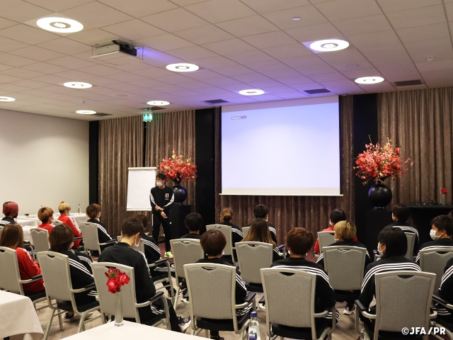 この日は夕方の現地到着ということもありトレーニングは行わず、散歩をし、夕食後にミーティングを実施。チームの目標を再確認し、この遠征での目的を共有しました。池田太監督からは改めて「世界一奪還」という言葉が選手にかけられ、その一歩目となる1月のAFC女子アジアカップインド2022に向けて、今回の遠征が非常に重要であることを全員で再確認しました。普段海外でプレーする選手にとっては池田太監督体制では初めての活動となりますが、ホテル内では既に互いにコミュニケーションを取りながら翌日からの本格的な活動開始に士気を高めました。